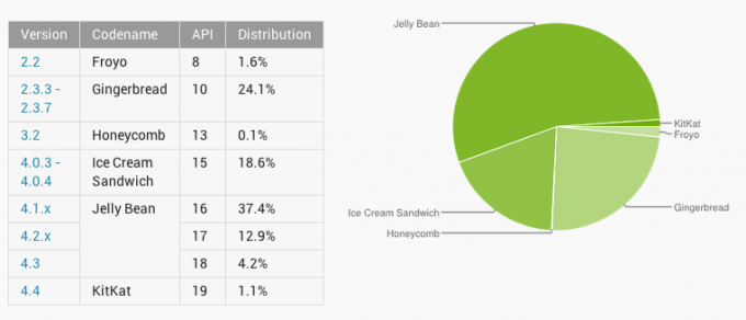 Google vient de publier un nouveau rapport sur l'adoption des différentes versions d'Android par les utilisateurs. Android 4.4 Kitkat vient juste de sortir et il est utilisé à environ 1,1 %. Android 4.1 Jelly Bean arrive en tête avec près de 37, 4 % suivi d'Android 2.3 Gingerbread avec 24,1 %.